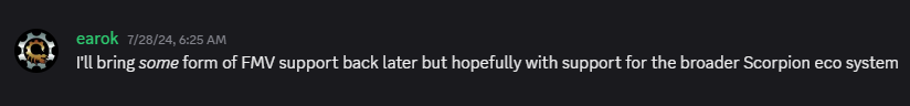 FMV support is not available yet (was dropped IIRC) but as Earok is a fan of FMV games (e.g. Road Avenger conversion) I'm sure it'll be available at some point.