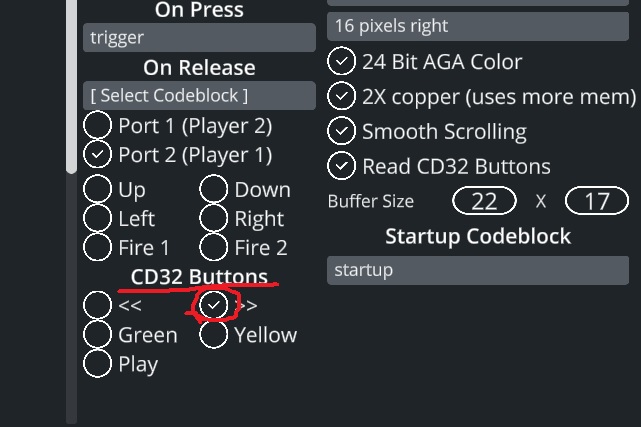 Hello Dante, I tested the actual release but I don't know if the previous update has also the same issue, if a CD32 pad is wired to my A1200/030 I can move the menu cursor through START and OPTION but no buttons is recognized. If I force my CD32 pad to acts as a 2 Button gamepad then the menu works as due. The Joypad CD32 is a KTRL, but I tested the KTRL Plus too. Both work and tested with JoyPortTest 0.3 on Aminet. Thanks for your support.